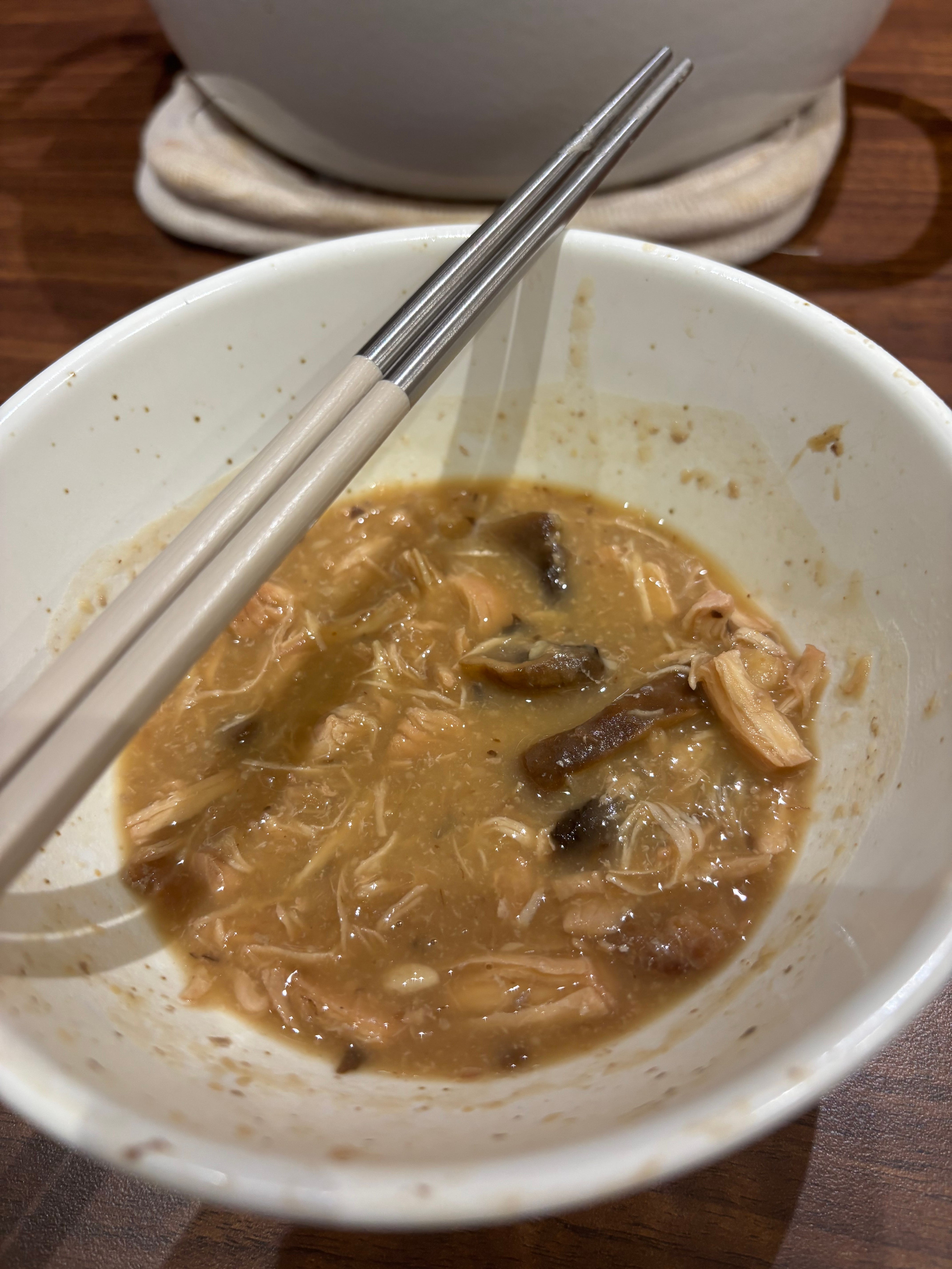 我看不出來哪裡有雞,只覺得整鍋像我吐出來的飼料一樣詭異。